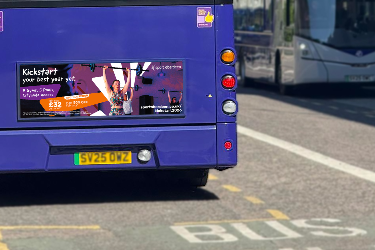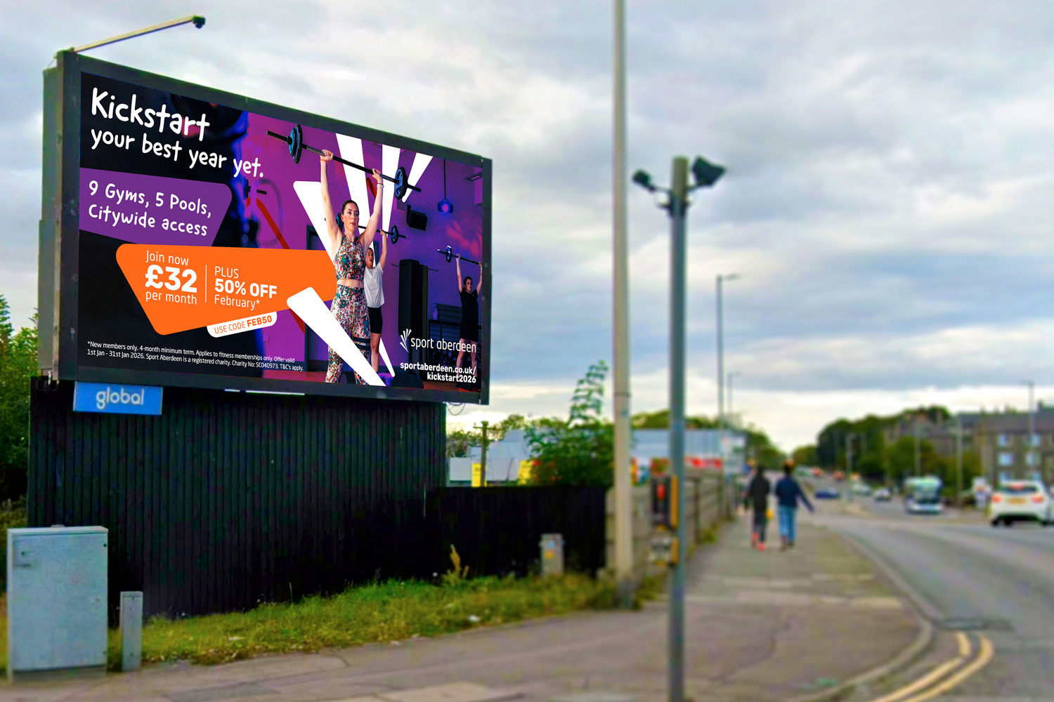 The creative concept centred on the tagline “Kickstart Your Best Year Yet,” using the shapes from the Sport Aberdeen fan symbol as a unifying visual element. Dynamic layouts placed central figures in engaging, energetic scenes, clearly communicating key messages while reinforcing brand personality. Assets ranged from large-scale billboards to handheld printed leaflets, ensuring consistency, adaptability, and maximum citywide impact.